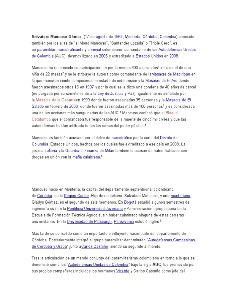 Salvatore mancuso gómez, also known as el mono mancuso,santander lozada or triple cero, among other names is a colombian paramilitary leader, once second in command of the united.
